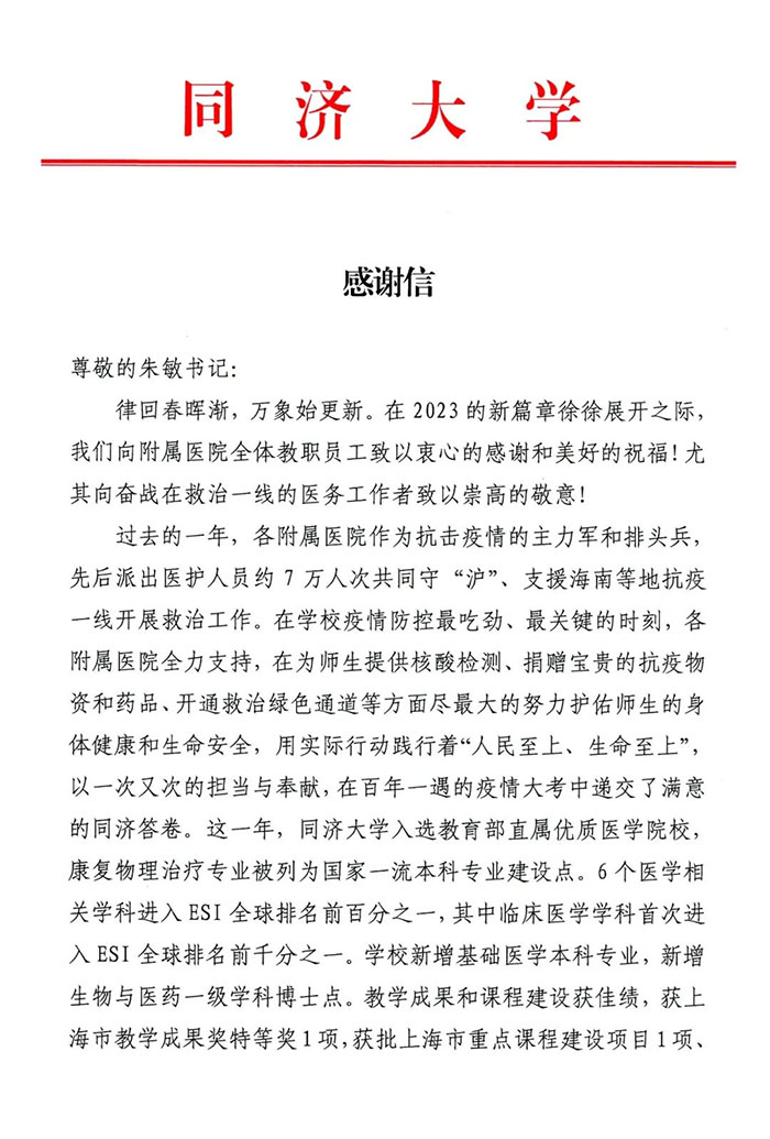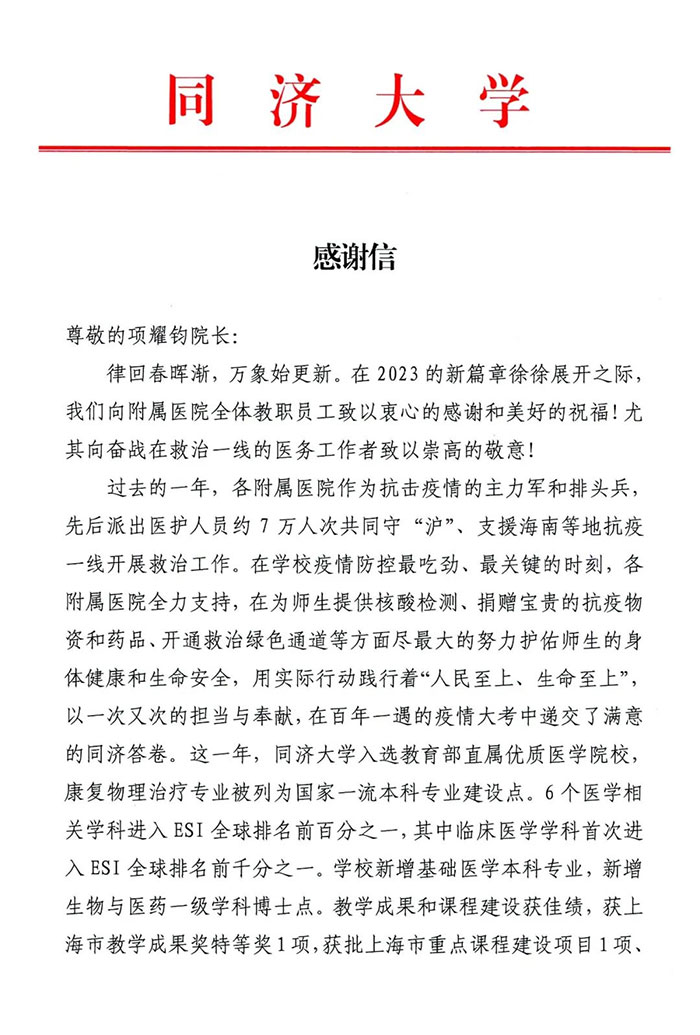 壬寅既末,癸卯将至。元月15日传统农历南方小年这天,上海蓝十字脑科医院党支部书记朱敏、院长项耀钧同时收到了来自同济大学给附属医院的感谢信。同享成果、共谋发展,展望未来征途,上海蓝十字脑科医院和同济大学将继续携手擘画同济医学新蓝图。
