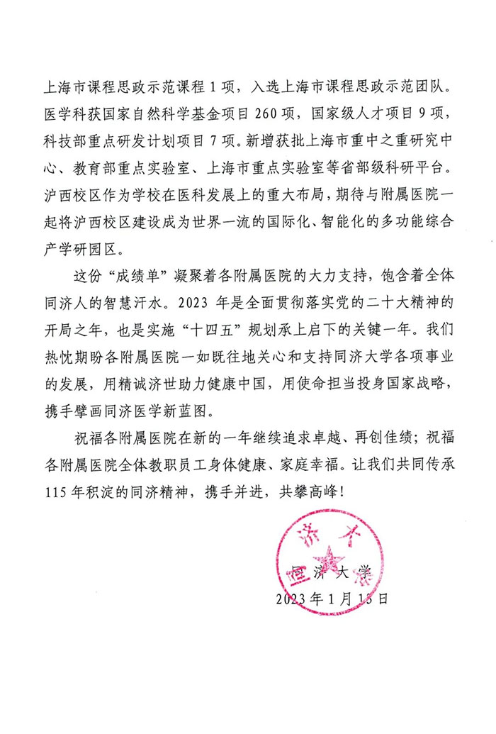 这份“成绩单”凝聚着各附属医院的大力支持,饱含着全体同济人的智慧汗水。2023 年是全面贯彻落实党的二十大精神的开局之年,也是实施“十四五”规划承上启下的关键一年。我们热忱期盼各附属医院一如既往地关心和支持同济大学各项事业的发展,用精诚济世助力健康中国,用使命担当投身国家战略,携手擘画同济医学新蓝图。