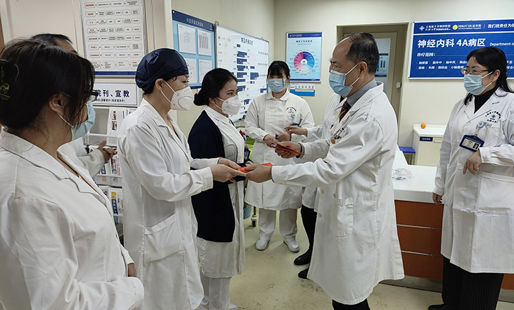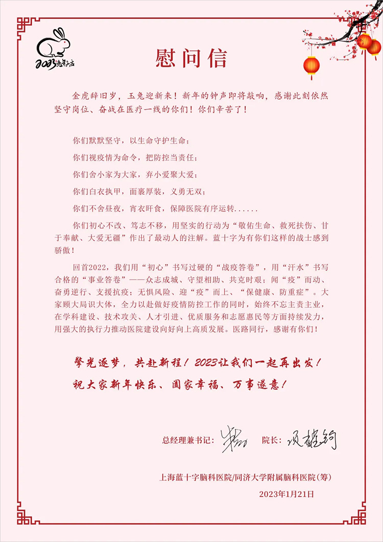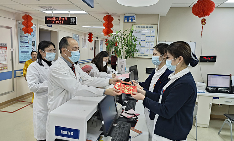 卯兔迎春,喜辞旧岁。2023年1月21日,农历除夕,院长项耀钧等院领导携行政总值班、护理总值班等深入各科室各部门,亲切慰问坚守岗位的医务人员和后勤保障人员,将新年红包、慰问信送到大家手中。