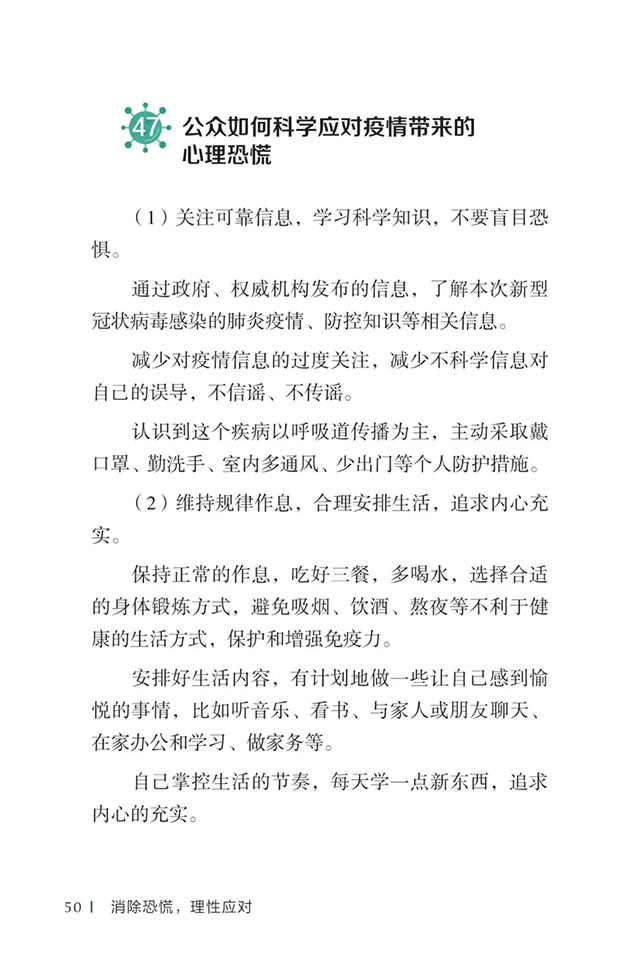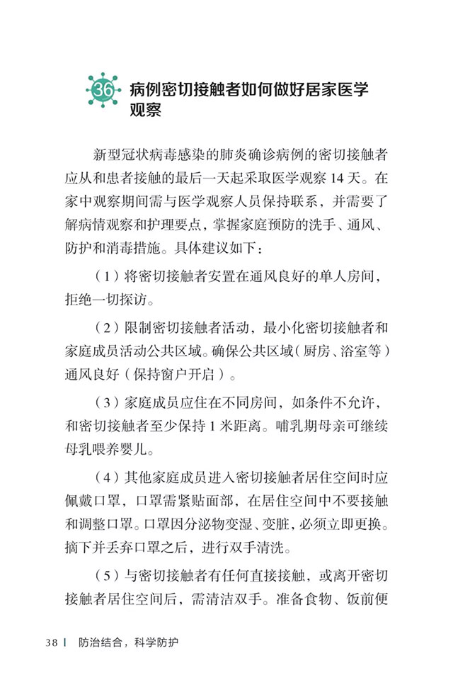 此书聚焦公众个人与家庭防护、居家医学观察、理性就医、心理疏导等防治细节,通过问答形式解读新型冠状病毒感染的肺炎有关问题疑惑,引导公众正确认识,积极做到防治结合、科学防护、消除恐慌、理性应对。此书包括图书、电子书、网络版读物等多种形式,第一批图书已紧急送往武汉抗击疫情第一线,电子书、网络版读物在学习强国、健康中国、人卫健康、掌阅等多个网络平台、微信公众号公益传播,并为全国各地提供可印制的PDF版本。