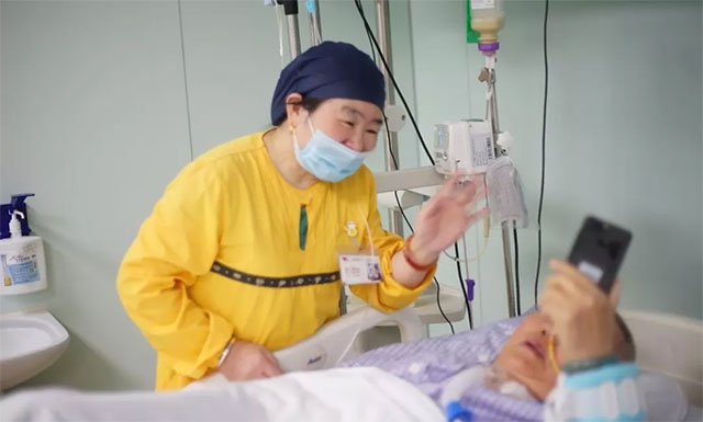 ▲ “连心桥”充满温馨与亲情:护工阿姨(左)通过病患(右)微信视频向病患家属打招呼