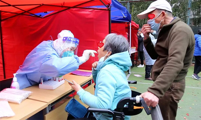 “爷爷,你在外面等一下,我出来给你采。”每当看到有坐着轮椅,行动不便的老人,李侨丽都会主动从核酸采样台出来,弯下腰、俯下身,甚至直接屈膝半跪在地上,为老人完成采样。让老人和家属都深受感动,赞叹不已。
