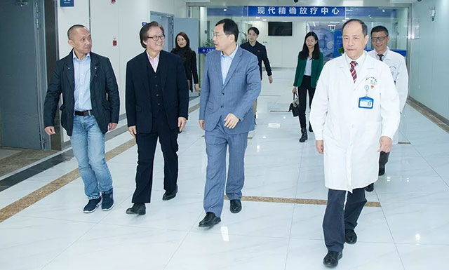 在重点科室中,Mark Wen一行最后参观了精准放疗温馨的诊疗环境,进入机房实地考察了中心最新引进的瑞典医科达Elekta第六代全数字化加速器。精准放疗王晓东主任介绍说,瑞典医科达公司是全球精准放疗的领导者,医院引进的这台设备是当前精准放疗的主流设备,它完全符合以“三精”(精准定位、精准计划、精准治疗)为特征的高能X射线放射治疗新技术的发展,可满足大部分放射治疗技术及高级应用,如三维适形放疗(3DCRT)、调强放疗(IMRT)、容积旋转调强治疗(VMAT)、立体定向放疗(SRT)等。可治疗头颈部肿瘤、胸部肿瘤、腹部肿瘤等全身各部位肿瘤,以及各种转移瘤,治疗精准、预后良好、并发症少,单次治疗时间仅需2-6分钟,可广泛适用于绝大多数肿瘤患者。