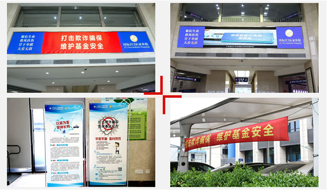 医院主楼外悬挂宣传横幅;门诊大厅LED屏幕上滚动播放闵行区医保局打击欺诈骗保宣传视频及宣传标语;大厅醒目位置放置了打击欺诈骗保专项行动相关知识及典型案例的宣传易拉宝等。