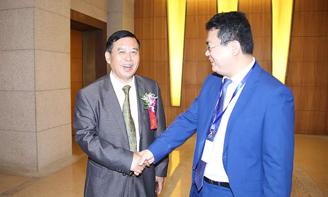 ▲ 十二届全国政协副秘书长、教科文卫体委员会副主任张秋俭与朱敏书记亲切交谈