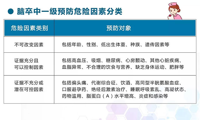 美国心脏协会/美国卒中协会卒中一级预防指南将脑卒中的危险因素分为3类:一是不可改变,二是证据充分且可以控制,三是证据不充分或潜在可控制的危险因素。