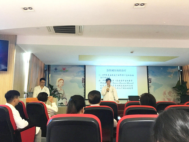在专题讲座会上,张陆弟主任通过多媒体课件详细介绍了高压氧医学的发展概况及高压氧的治疗适用范围、条件和禁忌症等。重点介绍了高压氧治疗的基本原理和治疗的主要疾病(如急性一氧化碳中毒、突聋、脑梗死、脑出血、眩晕等)。指出高压氧治疗作用如:压缩溶解禁锢在体内的气体、抑制厌氧菌、纠正细胞缺氧在临床急重危症的抢救中起到非常重要的作用。高压氧的对症治疗作用:如对炎症、各种水肿(如脑水肿、肺水肿等)、血管扩张性或痉挛性疼痛疗效快。对脑梗塞疾病,疗效更是明显。