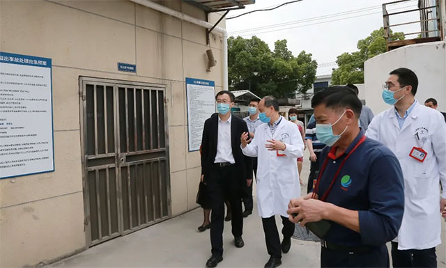 ▲ 上海市卫健委主任邬惊雷(前排右)一行抵达医院