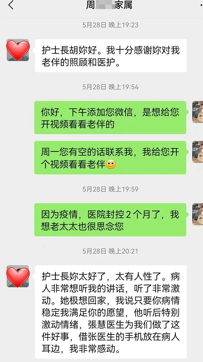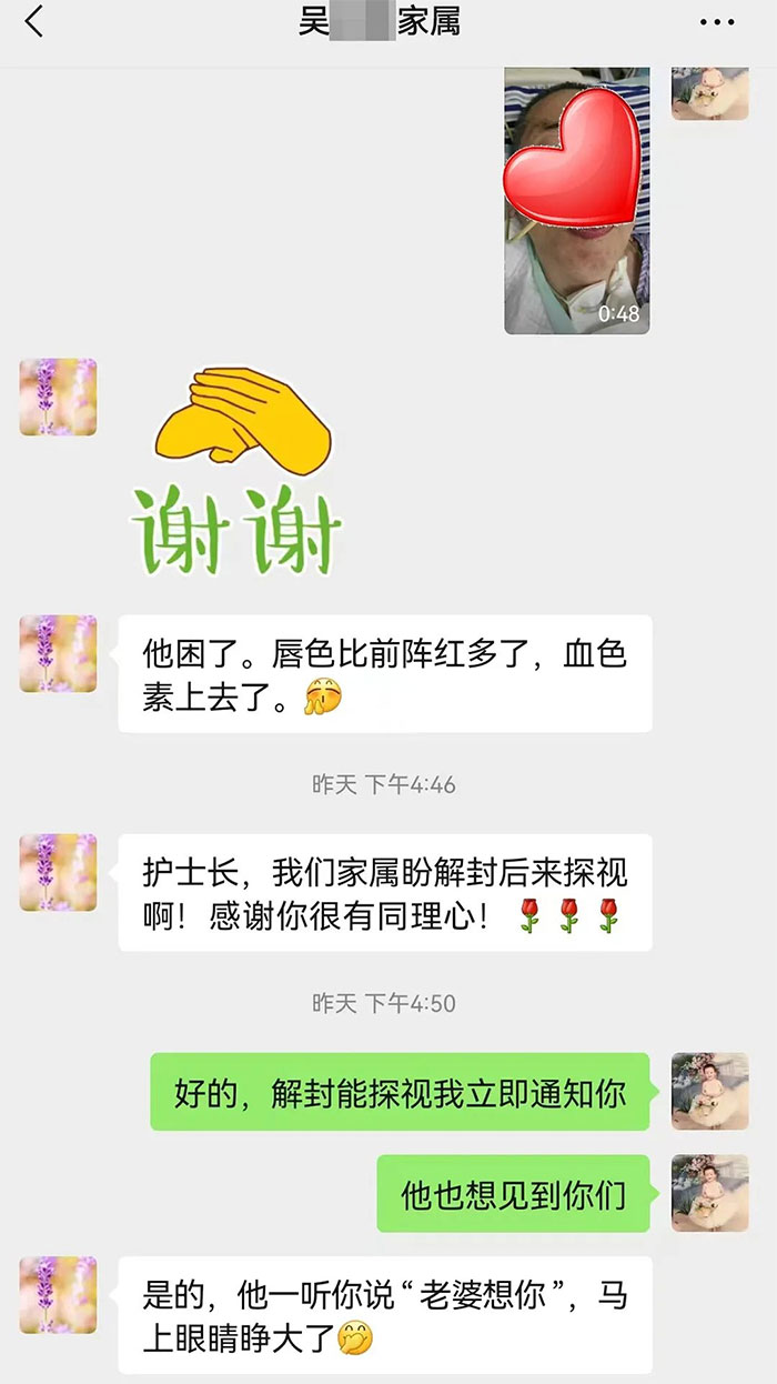 疫情防控之下,医院谢绝家属探视。8A团队推己及人,用拍照和录视频的方式将患者的病程进展尽可能具象地呈现给家属。患者陆某为脑出血患者,遗留肢体障碍,长期卧床,并发严重肺部感染,经过团队悉心救治病情平稳。家中四个女儿,尤其是小女儿远在国外,十分牵挂病重的父亲。为此,团队专门为她们建了一个微信聊天群,每天在群里发送老人的情况。小女儿只有每周二有空,胡燕华便定好闹钟,定时与其小女儿视频,让她每周都能通过视频见见父亲。还有更多的患者,也是通过8A团队这样的用心良苦以解相思之苦、牵挂之心焦。“辛苦了,万分感谢!”“太人性化了,很感动!”家属纷纷表达感谢!