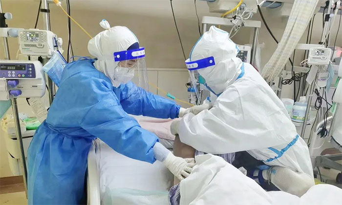 患者刘某,为脑出血高龄患者,遗留意识不清、四肢瘫痪等,长期卧床继发肺部感染。期间,刘某感染新冠,并发心衰及呼吸衰竭,命悬一线,张庆成主任顾不上自身风险,带领医护紧急予以气管插管和呼吸机辅助治疗,加强巡视查房及病情监测,并及时处置、调整救治措施,终于将患者从死亡边缘拉了回来……每天,8A团队至少需要抢救7、8名像刘某这样的危重症患者。“其实,为刘某这样的患者实施有创操作,团队是承担了很大的被感染风险的”,8A团队深知这一点,“但我们不能看着患者死,更不能当逃兵!”