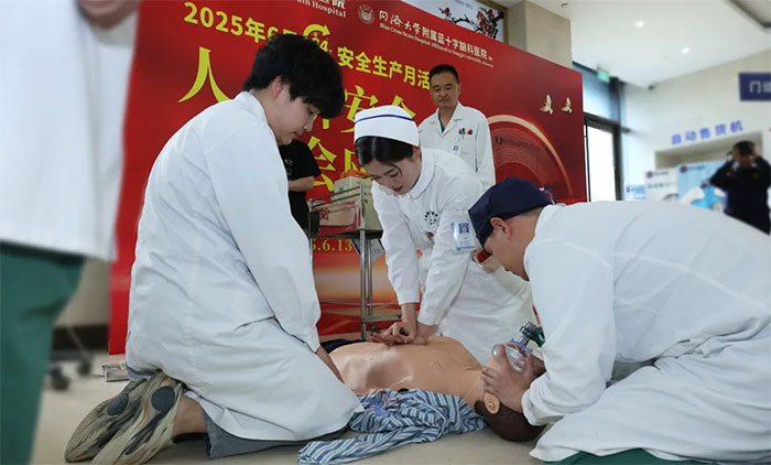 医疗急救:疏散过程中模拟有患者突发昏厥。医院CPR急救小组迅速就位,实施现场紧急心肺复苏,成功复苏“患者”。