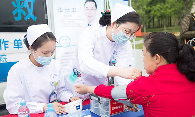▲ 上海蓝十字脑科医院护理人员为居民测量血压