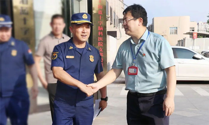 为全面提升辖区内大型医疗机构火灾防御能力,深入推进火灾防控工作,确保消防安全形势持续平稳,8月10日下午,闵行区消防救援支队政治部主任高顺才携七宝消防救援站站长潘曙鸿等一行10余人莅临上海蓝十字脑科医院进行辖区内重点单位消防安全突击调研。医院总经理兼书记朱敏、副总经理兼工会主席吴春芳、总务科副科长汪嘉伟、微型消防站站长陈伟智等陪同调研。