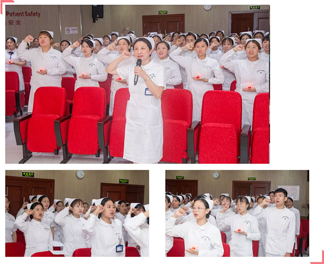 “我宣誓:志愿献身护理事业...坚定救死扶伤的信念...燃烧自己,照亮他人,把毕生精力奉献给护理事业...”全场红烛闪动,气氛神圣庄重,在副院长周咏梅领誓下,新护士举起右手,庄严地宣誓。铿锵有力的宣誓声响彻全场,承载着新护士背负起救死扶伤使命的承诺,从此,他们将踏上新的征程,忠贞职守,终其一生,成为护理战线上朝气蓬勃的生力军。