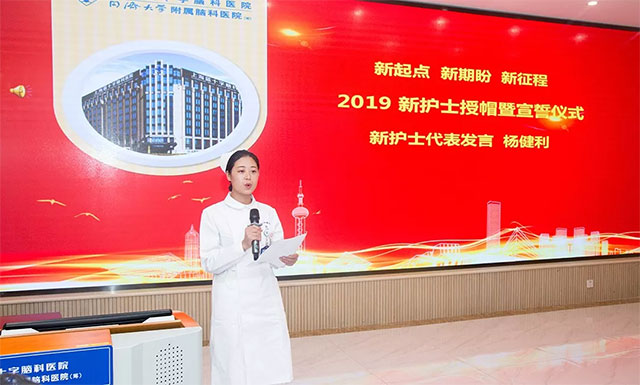新护士代表杨健利表示,在蓝十字脑科实习期间,收获了温暖、感动与成长。她将许多的“第一次”娓娓叙述,比如第一次面对昏迷患者血压骤升突发事件的无措,第一次为患者做鼻饲的紧张不安,第一次收到患者感谢信的感动...她说,“今天,接过前辈手中的蜡烛,被授予圣洁的燕尾帽,正式成为一名白衣天使,从此对生命有了一种更为神圣而光荣的使命感,我将继续努力,以实际行动将南丁格尔精神传承。”