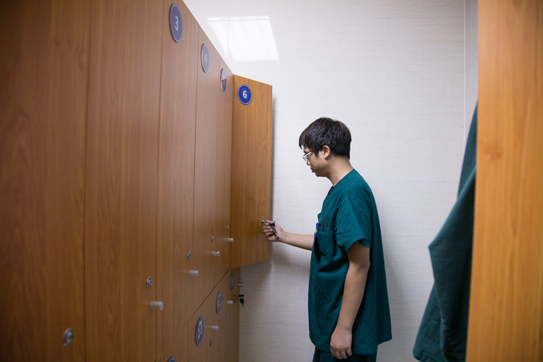 12:30,由于饭点已过,姑娘们帮忙带回来的饭菜已经冰凉,他吃的很快,并笑称这是长期养成的职业病。其实,护士是个繁忙且辛苦的职业,不光按时吃饭是一种奢侈,而通宵加班,24小时紧急待命更是ICU护士的家常便饭。长年累月下来,每个护理人员还会落下不同程度的职业病,张棕智也不例外,十几年大任务量的护理工作,让他的颈椎、手臂都有过度劳损症状,需不定期进行康复治疗。