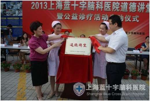 为深入贯彻实施《公民道德建设实施纲要》,进一步推进医院道德文明建设,加强医务人员职业道德修养,更好为人民群众的健康服务,8月28日下午,我院召开了“2013道德讲堂揭牌暨公益诊疗活动”启动仪式,徐汇区卫生局领导、徐汇区民营医疗机构领导、徐汇区田林街道领导应邀出席了仪式。徐汇区卫生局副局长朱福致辞,徐汇区民营医疗机构党委书记周玲芳、上海蓝十字脑科医院党支部书记朱敏为活动揭牌。
