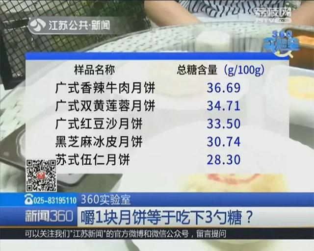 南京某媒体曾专门从市面上选购了多款不同类型的月饼,请南京市产品质量监督检验院对月饼糖分进行监测分析。结果显示:一款大家普遍认为“不甜”的咸辣口味广式香辣牛肉月饼,每100克含糖量高达36.69克。如果用家用勺子来称量的话,至少是3勺糖的分量。此外,较受市场欢迎的双黄莲蓉和红豆沙等蓉沙馅料月饼,总糖含量也普遍偏高,分别位居第二,第三。