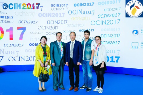 蓝十字人在OCIN大会会标前合影留念