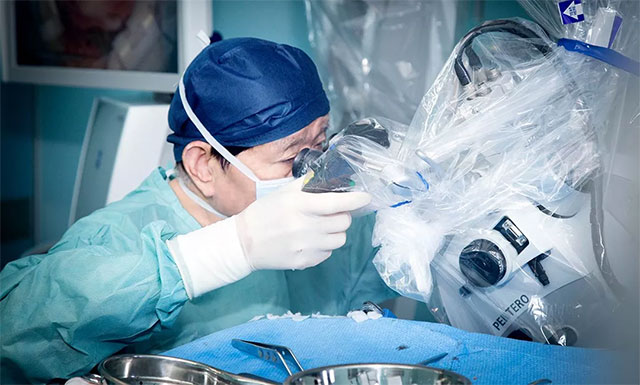 ▲ 通过蔡司显微镜(双荧光),沈教授为患者手术