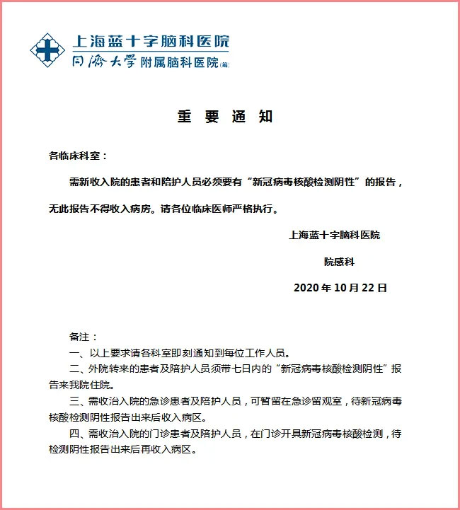 ▲ 10月22日公布的关于收入院患者及陪护人员须核酸检测的重要通知