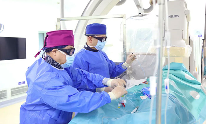 ▲ 席刚明教授、王贵平博士在进行下肢动脉硬化闭塞症血管开通及支架置入术