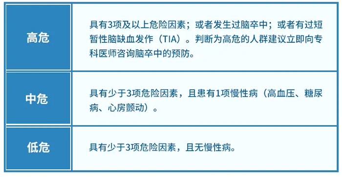 其中,“8”是指高血压、血脂异常、糖尿病、吸烟、心房颤动、超重或肥胖、缺乏运动、脑卒中家族史8项脑卒中主要危险因素;“2”是指发生过脑卒中或者有过短暂性脑缺血发作(TIA),并将危险人群划分为高危、中危、低危三个类别。