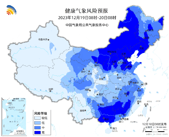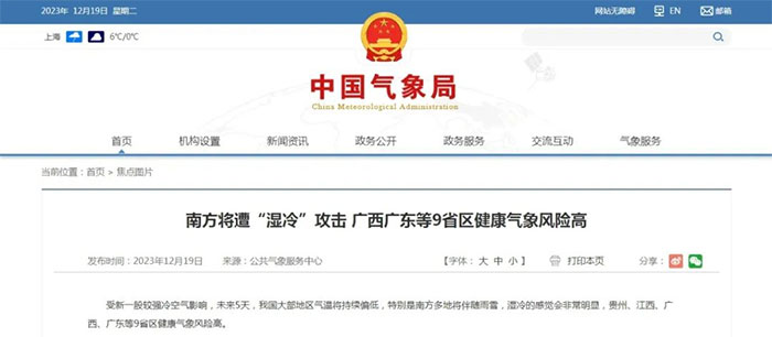 中国气象局公共气象服务中心12月19日发布健康气象风险预报,受新一股较强冷空气影响,未来5天,我国大部地区气温将持续偏低,特别是南方多地将伴随雨雪,湿冷的感觉会非常明显。