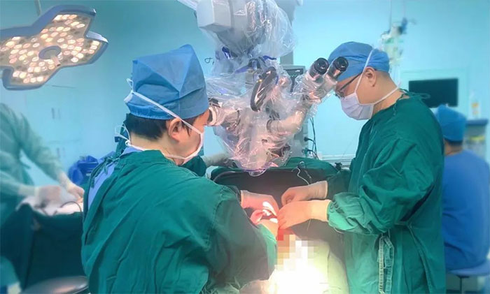 该手术属于神经外科高难度的四级手术,手术的精细化程度非常高,主刀医生需要有过硬的显微外科手术能力,通过蔡司显微镜(双荧光),以选取视野内管径与颞浅动脉顶支直径相仿的皮层支作为受体血管,用比头发丝还细的“10-0吻合针线”缝合,进行血管搭桥,不能有丝毫偏差。