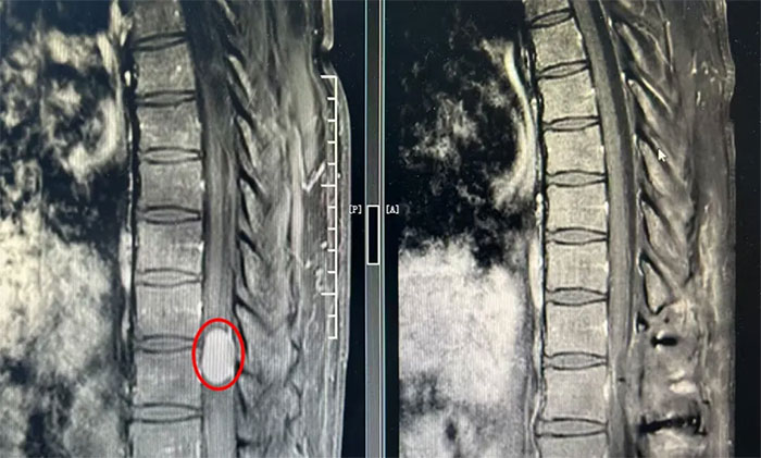 经详细检查,发现胸段椎管内髓外占位,考虑脊膜瘤。正是肿瘤压迫脊髓造成患者右侧下肢无力等症状,如果不及时手术治疗,可能导致患者完全截瘫,甚至或有生命危险。最终,卢云鹤博士团队迎难而上,顺利行胸椎椎管内肿瘤切除术。术后,患者肢体活动恢复正常,无新发神经功能缺损,现已康复出院。