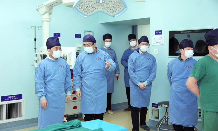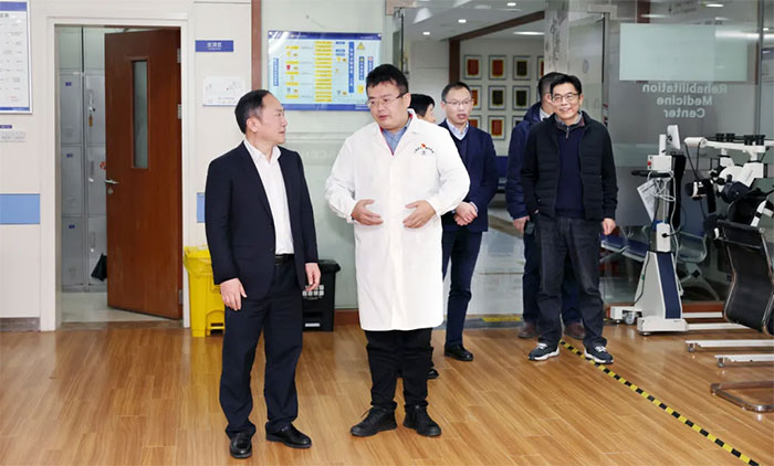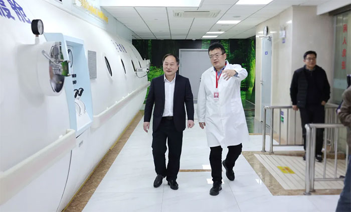 仪式结束后,在朱敏书记的带领下,张晓华教授等一行深入医院手术室、9F重症医学科、康复医学科、影像医学科、高压氧科、放疗科等特色科室实地参观,进一步加深对医院的了解,并就医院学科建设、人才培养、科研创新、医疗服务、医院管理等方面内容进行了互动交流。