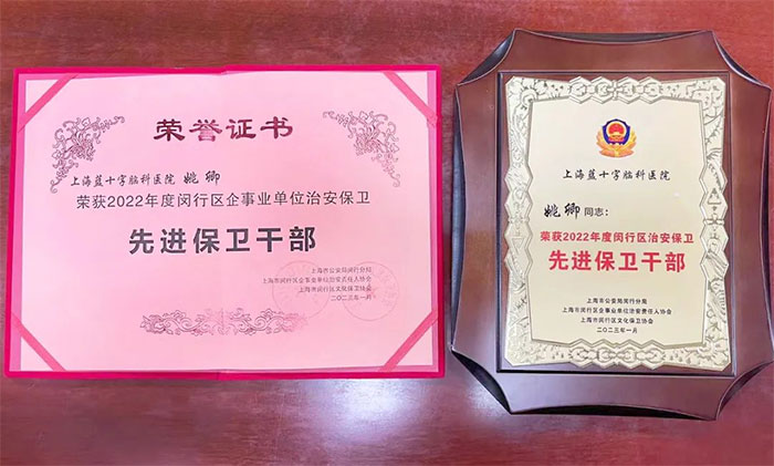 在表彰名单中,上海蓝十字脑科医院荣获“2022年度闵行区企事业单位疫情防控先进集体”称号,副总经理兼工会主席吴春芳被授予“优秀治安责任人”,院办主任姚卿被授予“先进保卫干部”。