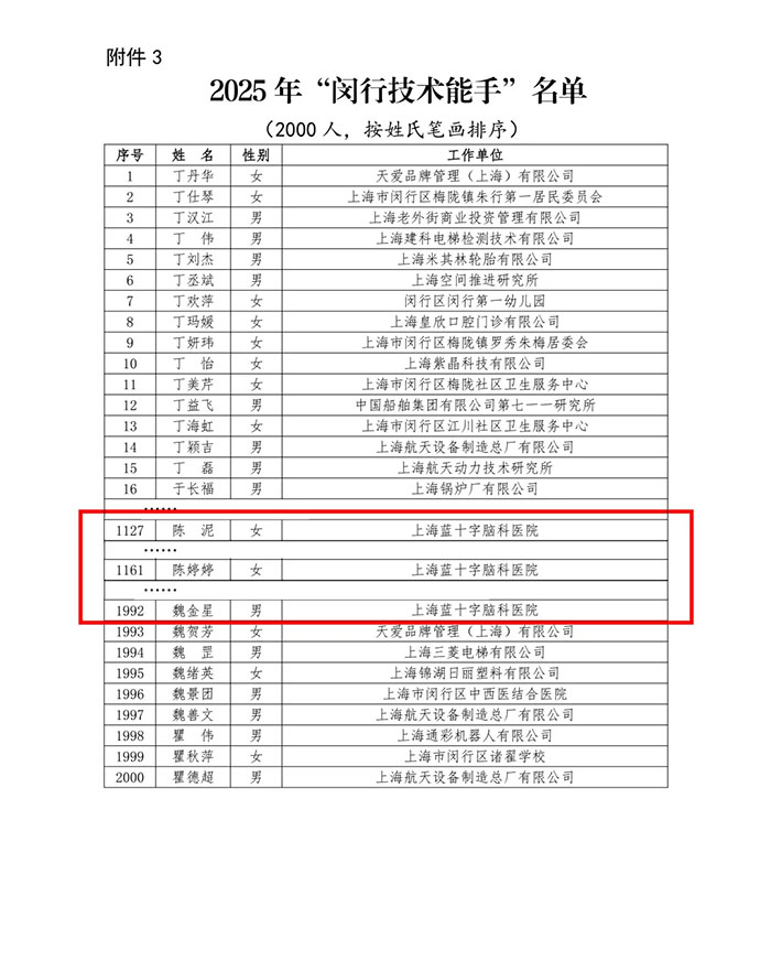 上海蓝十字脑科医院【同济大学附属蓝十字脑科医院(筹)】脑血管病四科(NICU)8B病区副主任陈泥、护士长陈婷婷,神经外一科6A病区医生魏金星三人荣获2025年“闵行技术能手”称号。