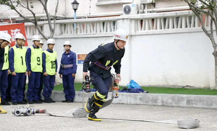 在“支线水带二带一枪操”竞赛项目中,消防员从起点线开始甩出第一盘水带,在奔跑途中连接第2盘水带与水枪,跑至终点处完成立射姿势,动作要求一气呵成。该项比赛重点考核队员在紧急情况下的快速反应、水带铺设、接口连接及精准射水等核心技能,对操作熟练度、体能耐力和心理素质均提出了极高要求。
