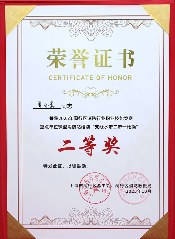 经过激烈角逐,上海蓝十字脑科医院微型消防站代表队队员周心意在比赛中脱颖而出,荣获2025年闵行区消防行业职业技能竞赛重点单位微型消防站组别“支线水带二带一枪操”二等奖。