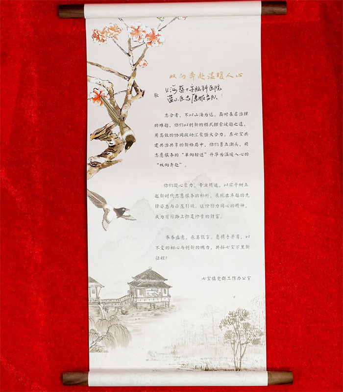 ▲ “蓝小医”志愿服务队被光荣授予2025年七宝镇“一育三给”先锋志愿服务团队荣誉卷轴