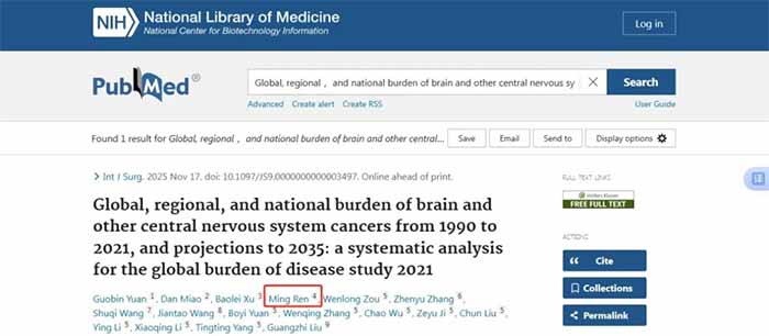 上海蓝十字脑科医院学术研究工作持续精进,学科建设成果斐然。近日,医院神经内科任明博士为核心成员参与完成的,以脑部和其他中枢神经系统癌症负担及预测为主题的研究论文在国际知名期刊《International Journal of Surgery》发表,并被SCI收录,该期刊最新影响因子高达13。