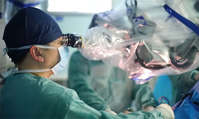 随后,专家团队根据患者的病情制定了周密完善的手术方案,在获得家属支持,手术准备就绪后,于4月24日,潘仁龙主任、吴治群博士领衔的专家团队为患者进行了颅内血肿清除手术。术中,蔡司显微镜(双荧光)下可见,患者脑组织内侧浅层有较多暗红色凝块,逐步清除血凝块,血凝块呈分叶状,并彻底清除术野血凝块,经过医护人员两个多小时的通力合作,手术顺利结束,患者安返神经外科重症监护室。