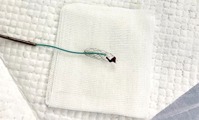 术中脑血管造影可见:左侧颈内动脉眼动脉段以远闭塞……余血管未见明显异常。张琪博士在刘春、周林华、李喆医生协助下,通过右侧股动脉穿刺,将微导管、微导丝送达左侧大脑中动脉M1段,经多次抽吸+支架拉栓,顺利取出血栓。造影显示,颈内动脉眼动脉段血流恢复。