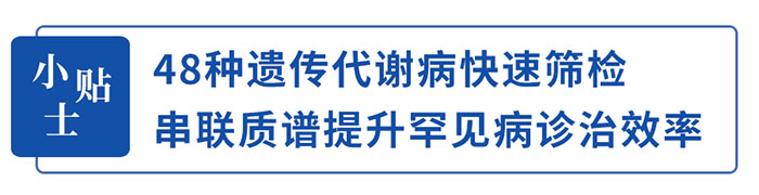 作为一种高灵敏度、高特异性的快速分析技术,串联质谱可同时测定生物样品中多种目标代谢物。一次实验即可筛查出包括氨基酸、有机酸代谢紊乱、脂肪酸氧化缺陷在内的48种遗传代谢性疾病,检测速度快,2分钟左右即可完成1个样本检测,大大扩展了可筛查的疾病谱,提高了筛查效率。