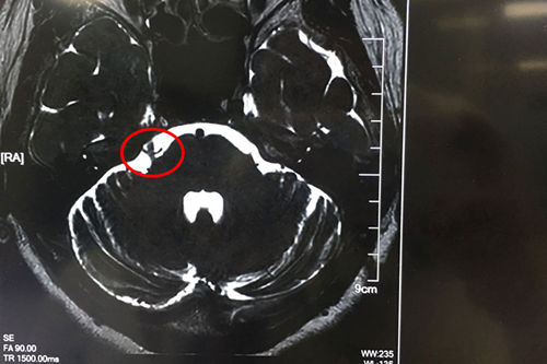 术前核磁影像显示:右侧三叉神经颅内段根部见小血管碰触(两条细小血管跨越并与之接触)