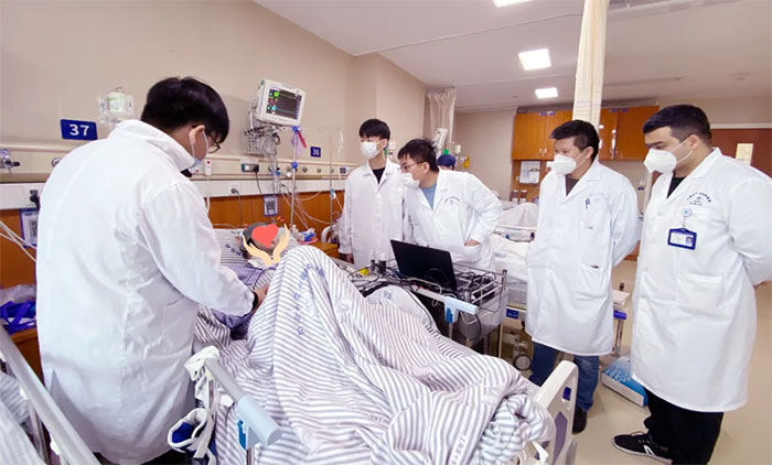 ▲ 医院脑复苏中心团队、华东理工大学团队在为昏迷患者进行脑机接口评估