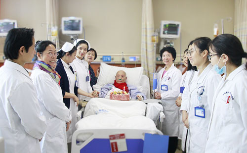 11月15日上午十点半,戴秀珍主任带领医护人员手捧鲜花走进病房来到姚老爷子床前,当戴主任送上为他精心准备的鲜花时,姚老爷子竟然哭了起来。