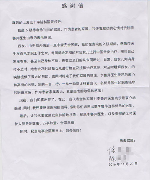 我是6楼患者徐XX的家属,作为患者的家属,我怀着激动的心情对贵院李鲁萍医生由衷地表示感谢。