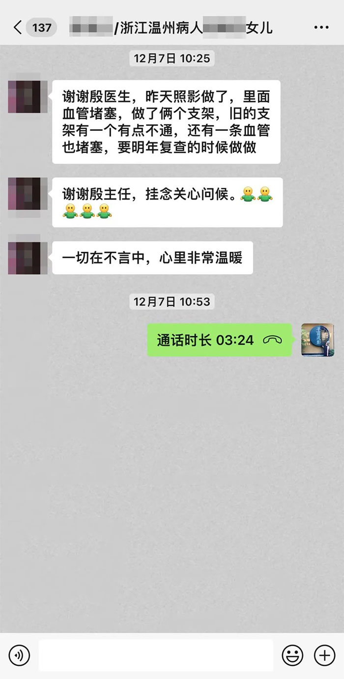 陈伯伯的女儿陈女士对殷主任及其团队非常感激,直言:“(蓝十字)医院条件好啊,效果好啊,不虚此行。”没想到在蓝十字的18天里,陈伯伯能够得以好转并具备可接受手术条件。在安排转院后的微信联系中,陈女士毫不掩饰地回复殷主任:“非常感谢您一切(转院对接事项)办的妥妥的,要不然我就像一只无头苍蝇乱走。”在手术成功后陈女士高兴地委托病房护工送来锦旗,并给殷主任发消息:“一切在不言中,心里非常温暖。”