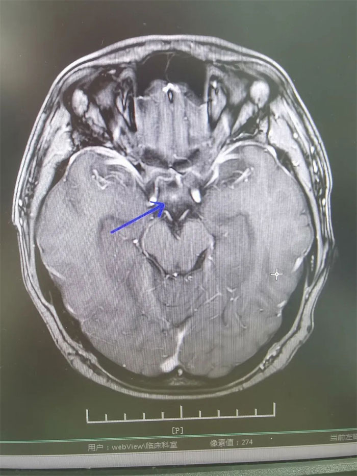 肿瘤科(放疗)王晓东主任详细了解了患者的病史,并进一步完善检查。在查体时,小刚表示近期感到头痛,偶有恶心呕吐。垂体增强MRI示:垂体术后,垂体区及松果体区占位,视交叉受压,右侧海绵窦局部受累,第三脑室扩大,梗阻性脑积水形成,提示病情进一步加重。